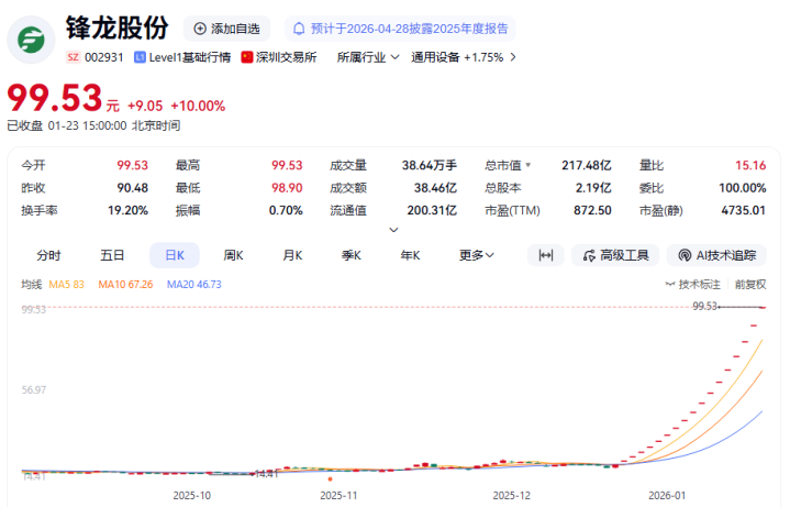 市场上,截至1月23日收盘,锋龙股份(002931.SZ)斩获18连板,最新股价报99.53元/股,总市值为217.48亿元。